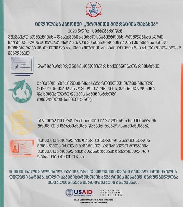 2023 წლის პირველი სექტემბრიდან „შრომითი მიგრაციის შესახებ“ კანონში ცვლილებები შევიდა, რომლის მიხედვითაც, უცხოეთში დამსაქმებელი  შუამავალი კომპანიებისთვის კონკრეტული ვალდებულებები გაიწერა.