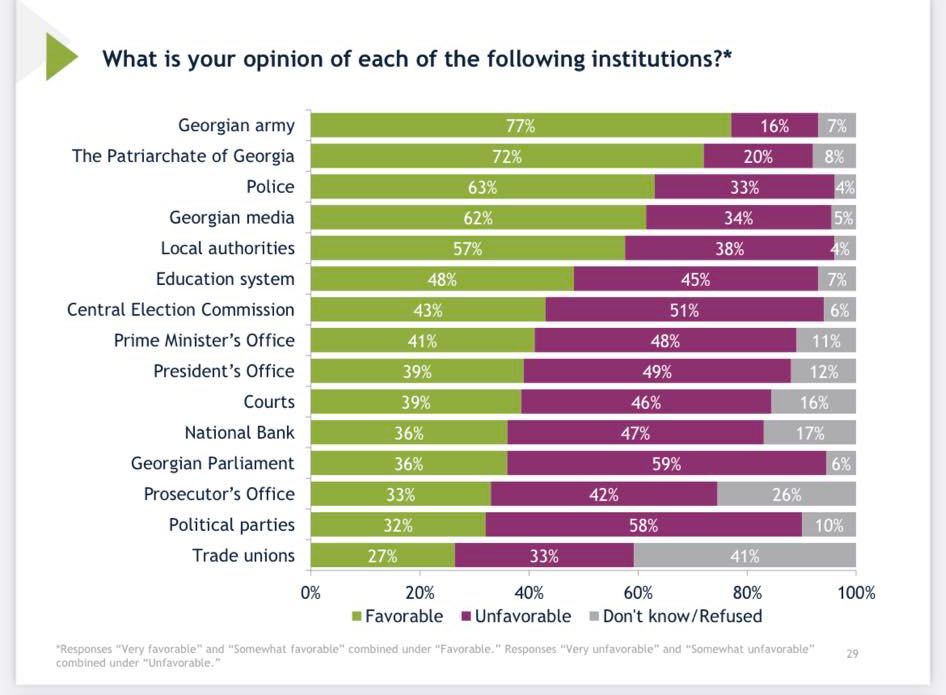 საზოგადოება წინა წელთან შედარებით, წელს კიდევ უფრო მეტად ენდობა პოროფკავშირების საქმიანობას. თუ შარშან 27% აფასებდა ორგანიზაციის საქმიანობას დადებითად, წელს ეს მაჩვენებელი 31%-მდე გაიზარდა. ასევე, მკვეთრად, მთელი 6%-ით არის შემცირებული ნეგატიური შეფასების მაჩვენებელიც, რომელმაც 33-დან 27%-მდე დაიწია და ჩამოთვლილი თხუთმეტი ინსტიტუტიდან, ჯარისა და საპატრიარქოს შემდეგ, პროფკავშირების საქმიანობას ყველაზე ნაკლები უარყოფითი შეფასება აქვს.